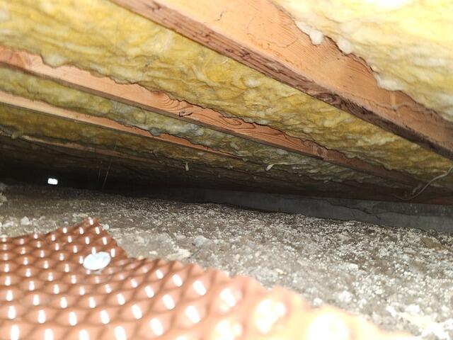 This wet, dirt crawl space needed serious help. Excess water vapor was causing the insulation to get damp and heavy, trapping moisture against the floor joists.